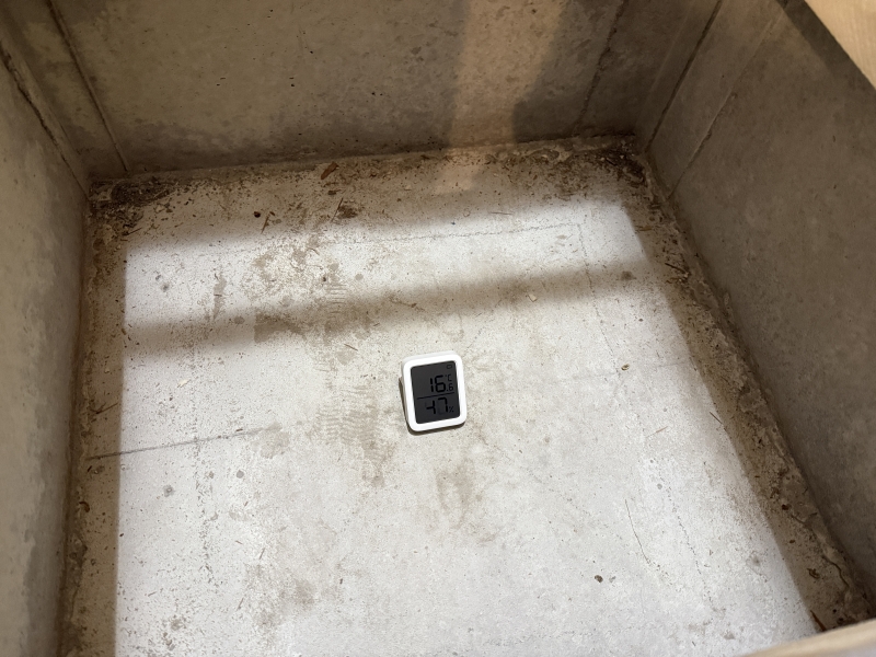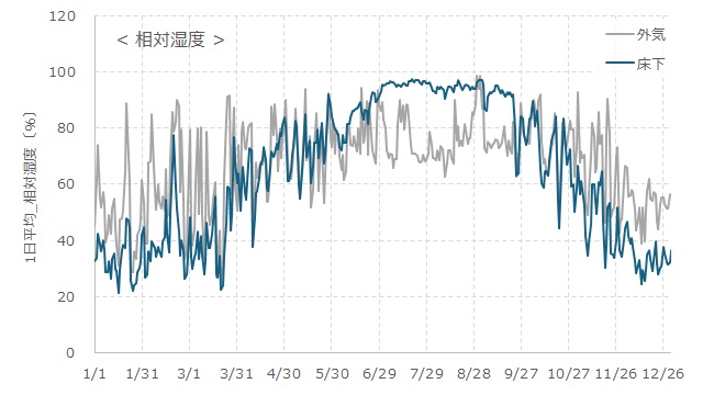ある程度予想はしていましたが、梅雨から夏場にかけて床下は相対湿度が90%を超える状況が続くため、収納として活用することはおすすめできません。